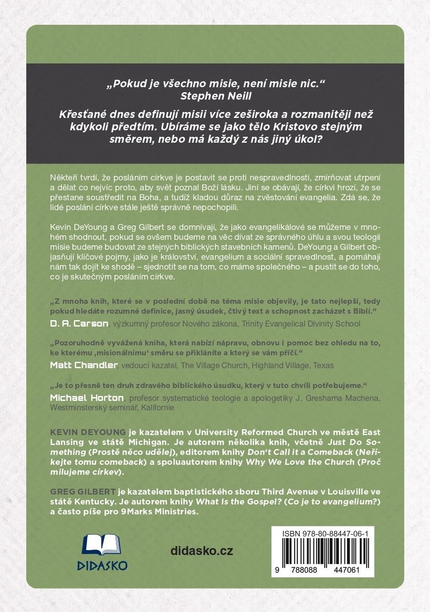 Kevin DeYoung a Greg Gilbert sa domnievajú, že ako evanjelikáli sa môžeme v mnohom zhodnúť, pokiaľ sa budeme na vec pozerať zo správneho uhla a svoju teológiu misie budeme budovať z rovnakých stavebných kameňov. Objasňujú kľúčové pojmy ako je kráľovstvo, evanjelium a sociálna spravodlivosť, a pomáhajú nám nájsť zhodu - zjednotiť sa na tom, čo máme spoločné - a pustiť sa do toho, čo je skutočným poslaním cirkvi.